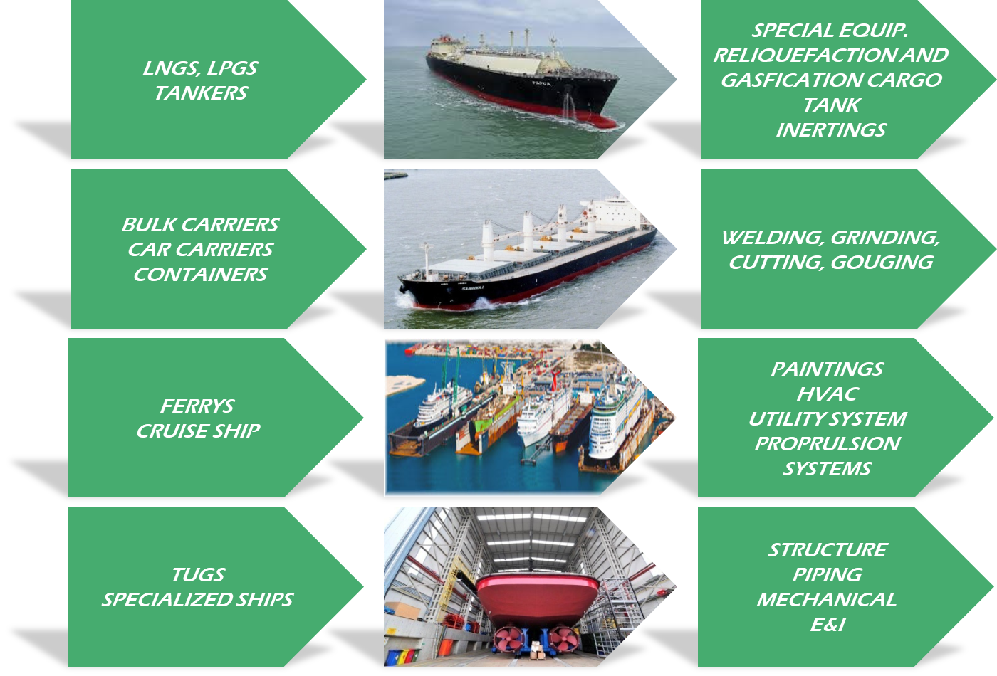We also meet the regular repairing schedule of each ships as well as we are always ready for each discipline work at dry dock, such as hull, structure, piping, welding, painting, electric, instrument and mechanic.